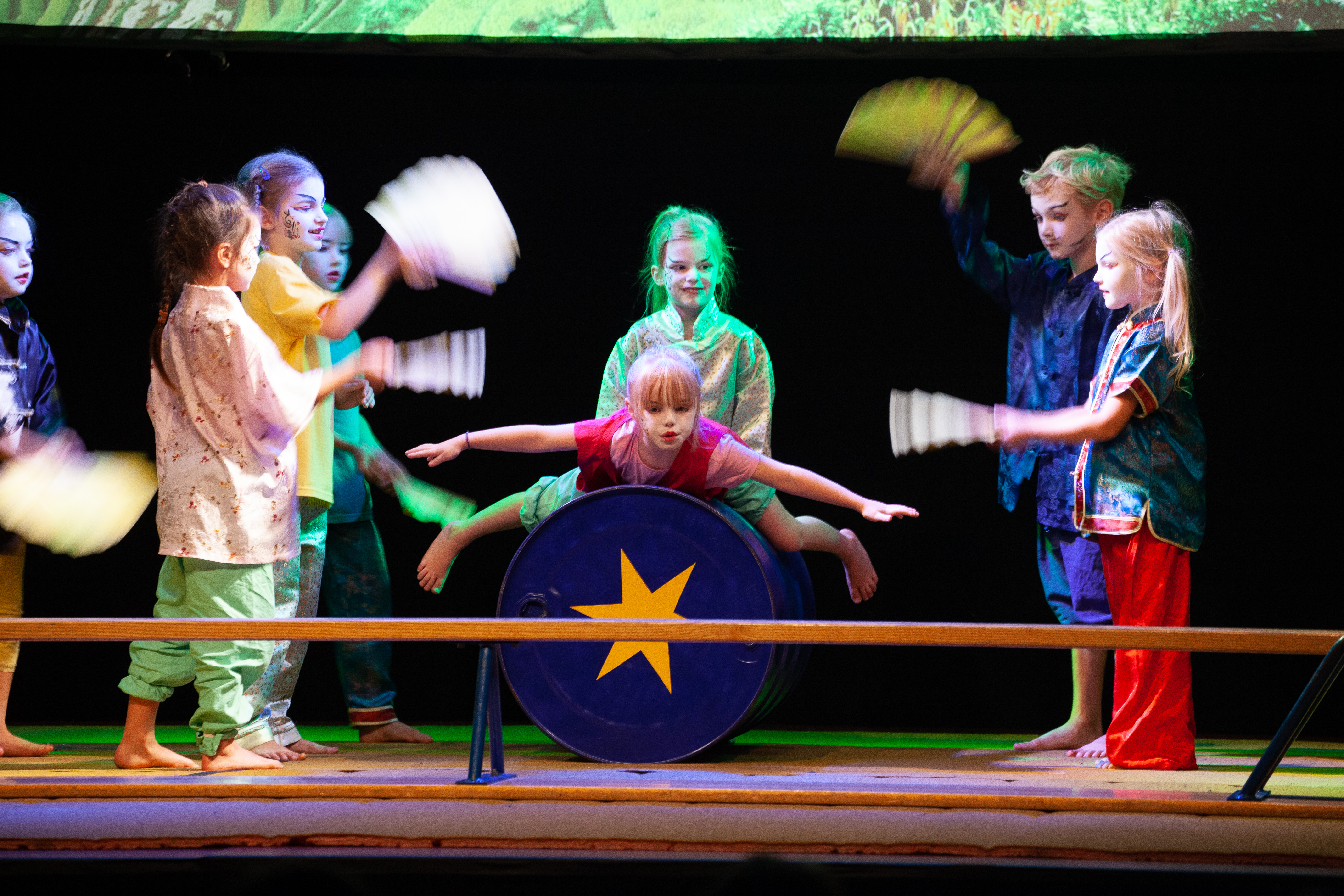 Spielerisches Entdecken von Balance (Fass laufen, Balken / Seil balancieren), Akrobatik (Kraft und Beweglichkeit, Rollen, Springen, Stützen, Bodenakrobatik, Pyramiden) und Koordination (Jonglieren mit Tüchern und Bällen, Hula-Hop, Poispiel). Rhythmische Übungen und Spiele.